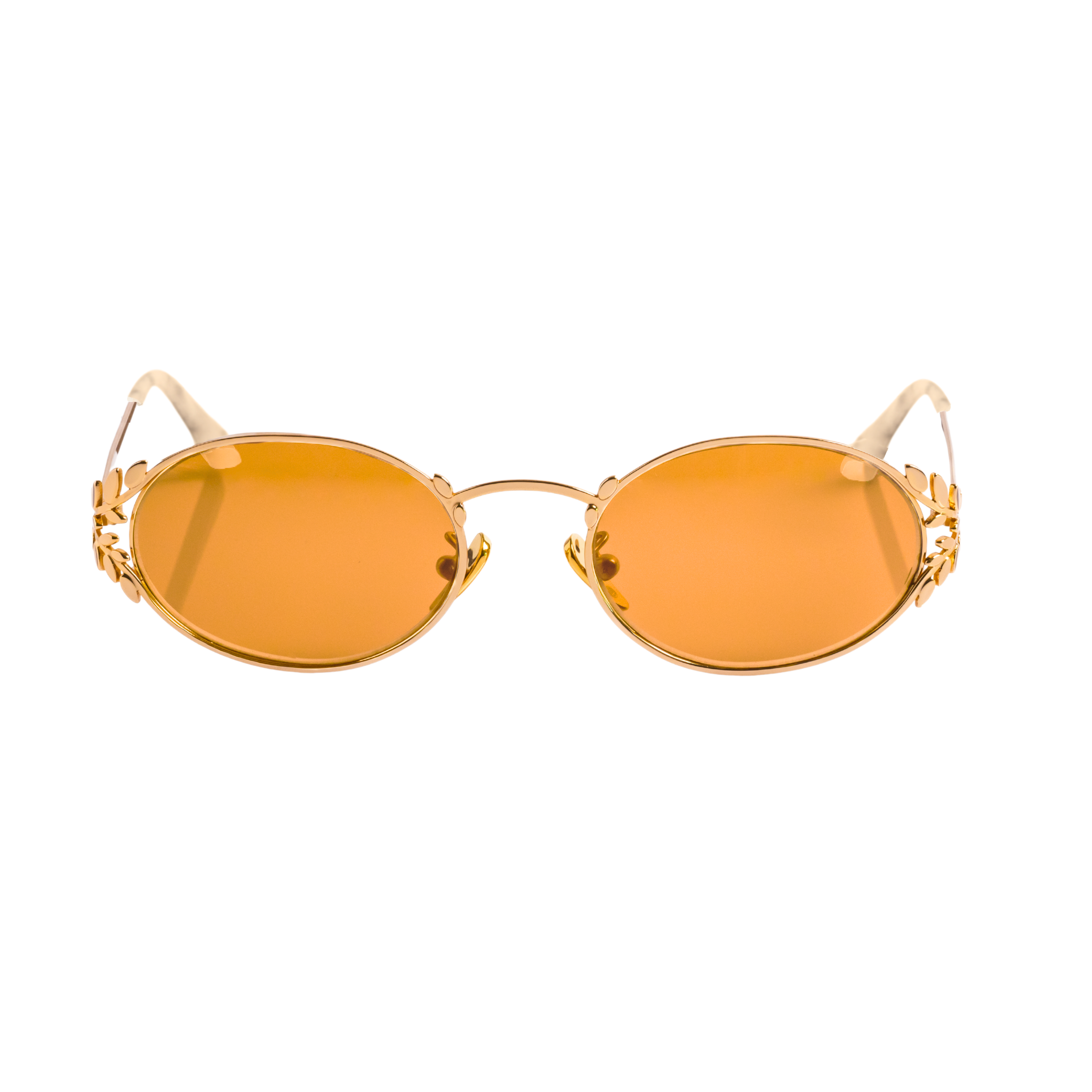 Wearing: Memorí Oval Laurel frames in gold with warm brown lenses, styled with the Eden Scarf Top